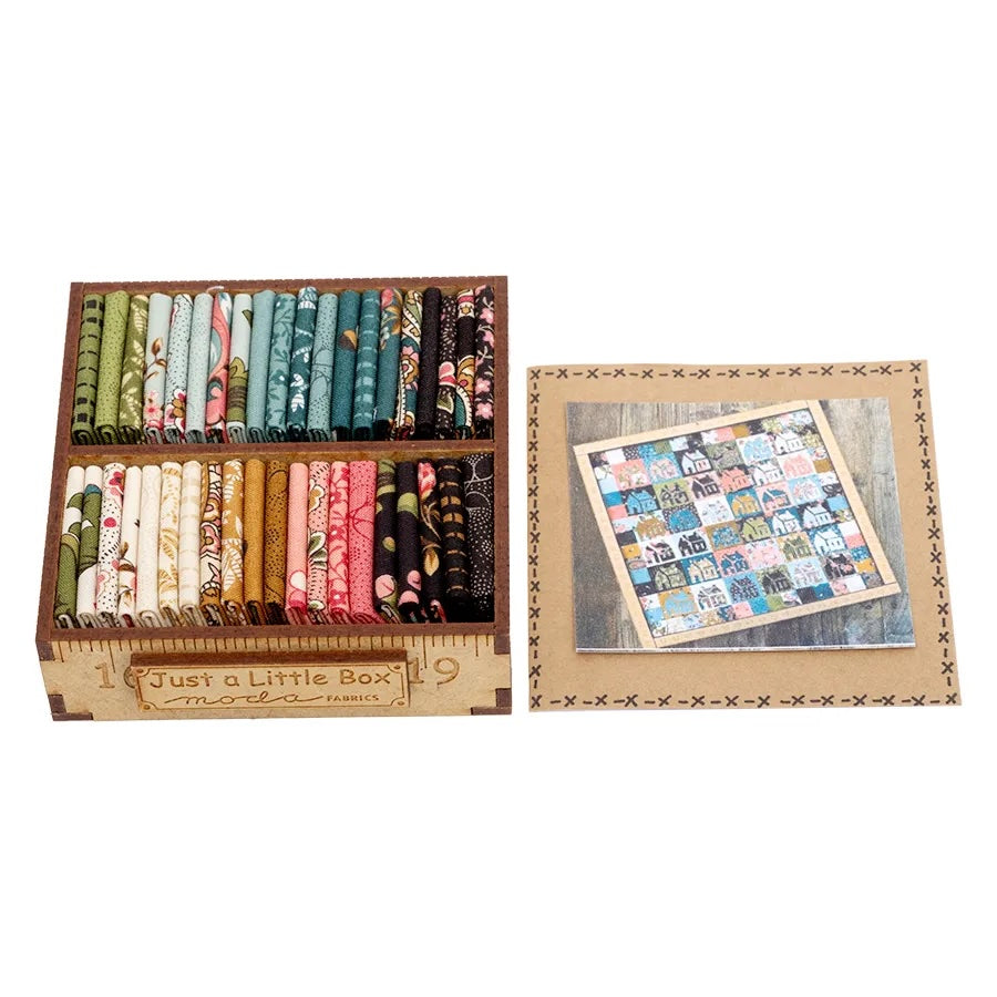 Just a Little Box project includes 42 4" squares of fabric from the "Collection for a Cause - Unity" line by Howard Marcus and a pattern to make the mini 16" House Quilt, all packaged in a 3.5" little wood box.
