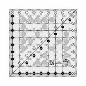 This 9-1/2 inch square is the perfect companion for anyone who loves to work with the 10 inch pre-cuts on the market. The diagonal line makes trimming half-square triangles created with 10 inch squares a piece of cake. It features easy-to-read black and white markings printed in 1 inch grids marked in 1/8 and 1/4 inch increments. Use the easy-to-read, black numbers (printed on white dots) and the 1/4 inch grip sides to cut whole inches. The 1/4 inch dashed lines printed on two adjoining sides aid in trimming seam allowances.