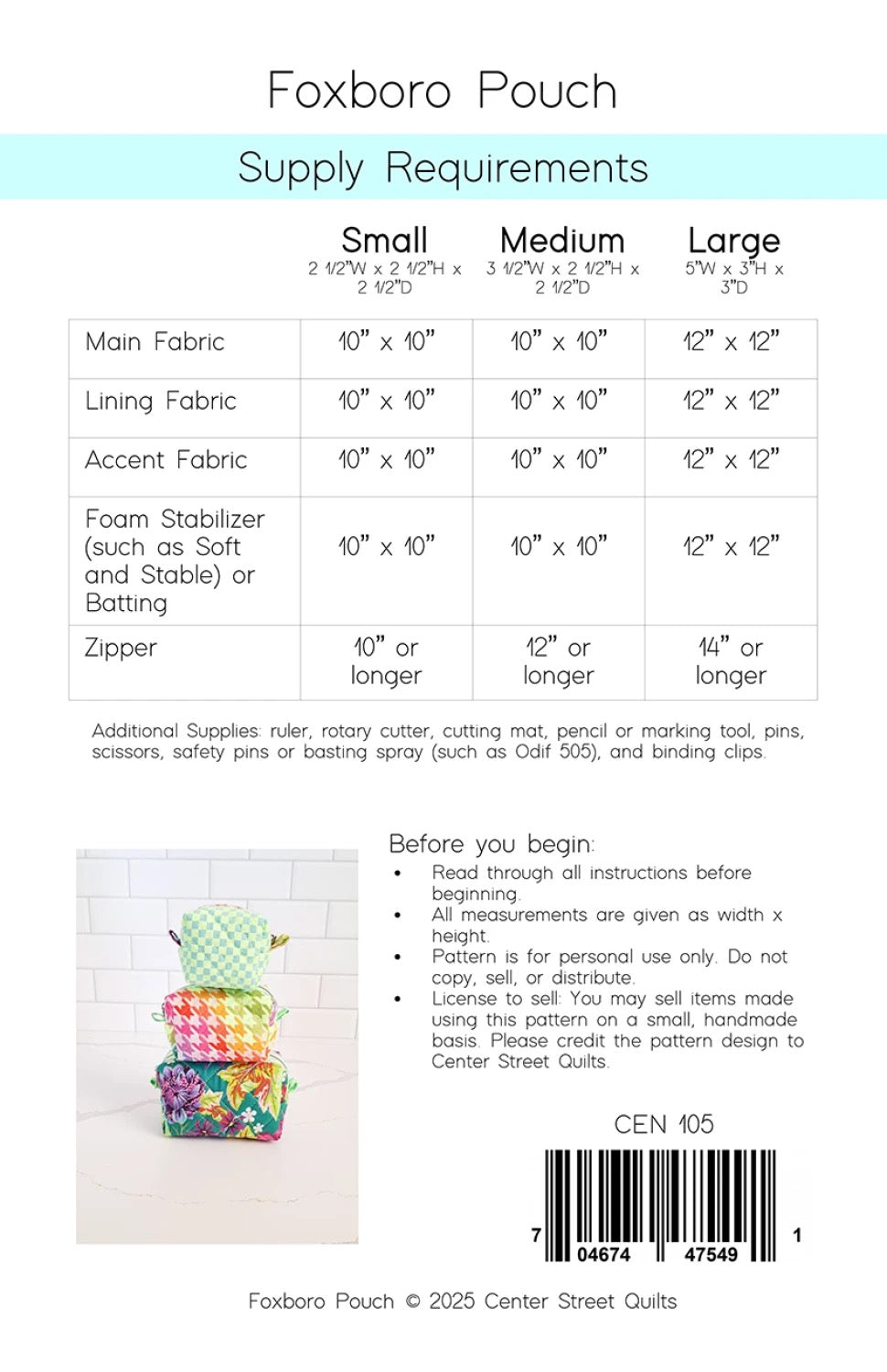 The Foxboro Pouch Pattern is a quilted zipper pouch pattern that includes three size options. These tiny boxy pouches are perfect for storing your tiniest belongings: binding clips, safety pins, spools of thread, small sewing notions, earbuds, a deck of cards, band-aids, makeup, jewelry, etc.