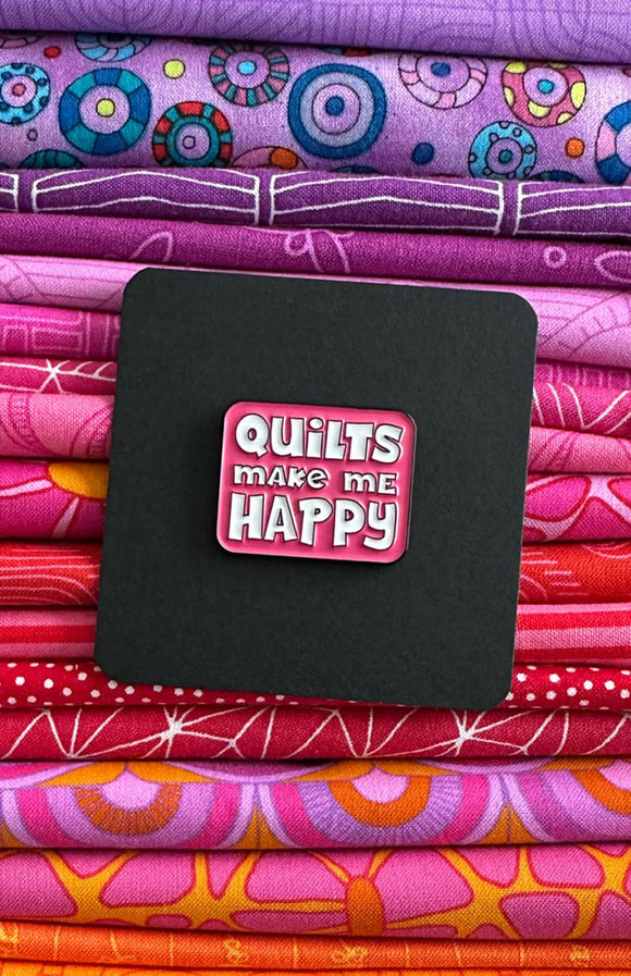 The Quilts Make Me Happy Enamel Pin is such a cute way to show our love of quilts to the world! This pin features the phrase "Quilts Make Me Happy" in white lettering on a pink backdrop. Pin is made of zinc alloy has two rubber clutches on the back side. 1.25"