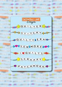 These crafting themed Friendship Bracelet Sticker Sheets are the perfect for any maker who is creating with Taylor Swift playing in the background! Each sticker sheet has 7 bracelet stickers featuring 7 different crafting related words and phrases. All our stickers are made of a thick durable vinyl with a protective laminate coating. 3"x4"