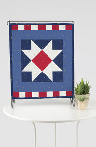 Kit includes tabletop banner pattern, fabric for the banner top, back, sleeve, and binding. 12.5x14.5