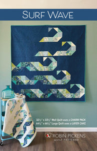 Surf Wave is a quilt pattern in two sizes, Large 64 x 66" and Small 32 x 33" (great for a summer cottage wall!). Modern waves twist and curl, using Layer Cake 10" squares for the large or Charm Pack 5" squares for the small. Enjoy the summery surf and sea with this coastal themed quilt.
