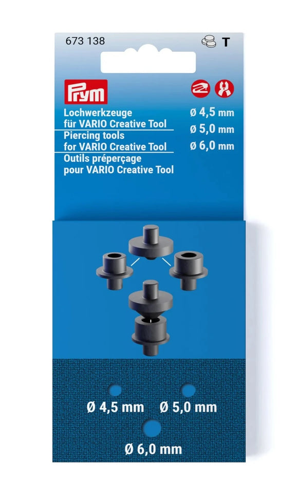 In order for eyelets, rivets, snap fasteners or other no-sew items to embellish the fabric, a hole usually has to be punched first. With the hole punch tools from Prym and the VARIO Creative Tool, this can be done easily and precisely. Hole punch tools in sizes 2.5, 3.0, 3.5 and 4.0 mm are already included in the original packaging of the VARIO Creative Tool. If they are lost, the tool set in these sizes can be used as a replacement. Six hole punch tools are ready for immediate use. The second tool set, with five tools, covers larger diameters: holes with diameters of 4.5, 5.0 and 6.0 mm are punched with ease. An ideal addition, especially for anyone who likes to use large eyelets or holes as decorative elements.